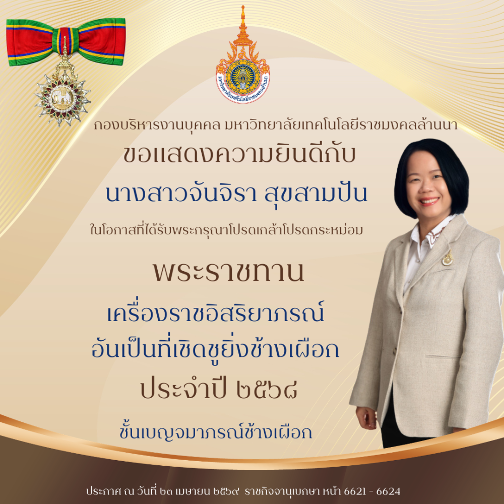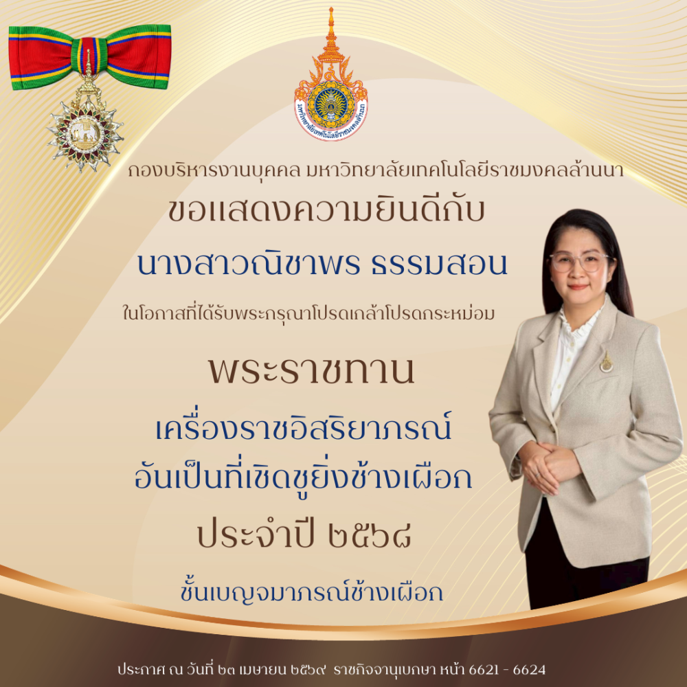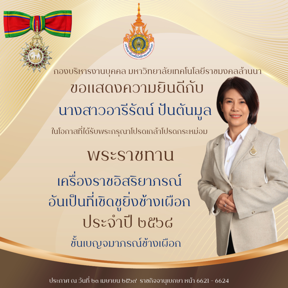 โลโก้เว็บไซต์ ขอแสดงความยินดีกับทุกท่านที่ได้รับ พระราชทานเครื่องราชอิสริยาภรณ์อันเป็นที่เชิดชูยิ่งช้างเผือก และเครื่องราชอิสริยาภรณ์อันมีเกียรติยศยิ่งมงกฎไทย ชั้นต่ำกว่าสายสะพาย ประจำปี ๒๕๖๘ | กองบริหารงานบุคคล มหาวิทยาลัยเทคโนโลยีราชมงคลล้านนา