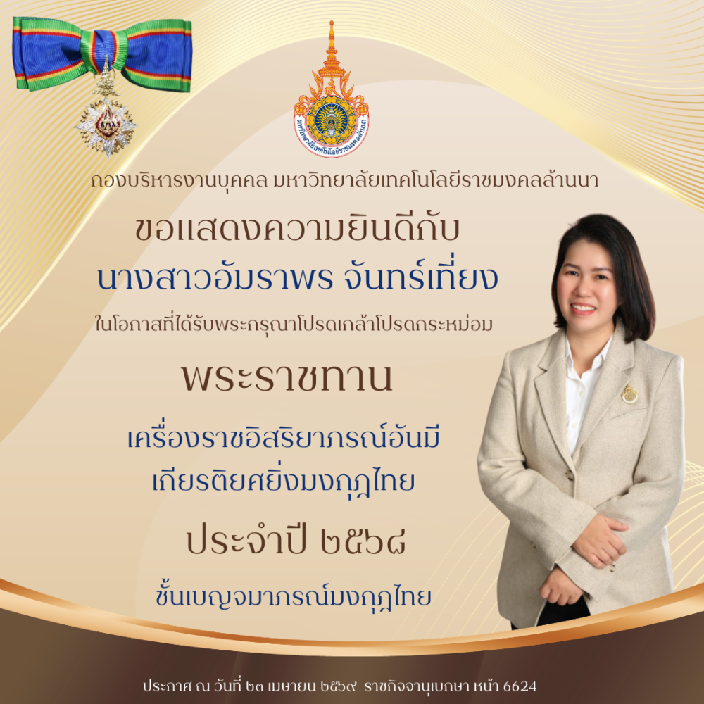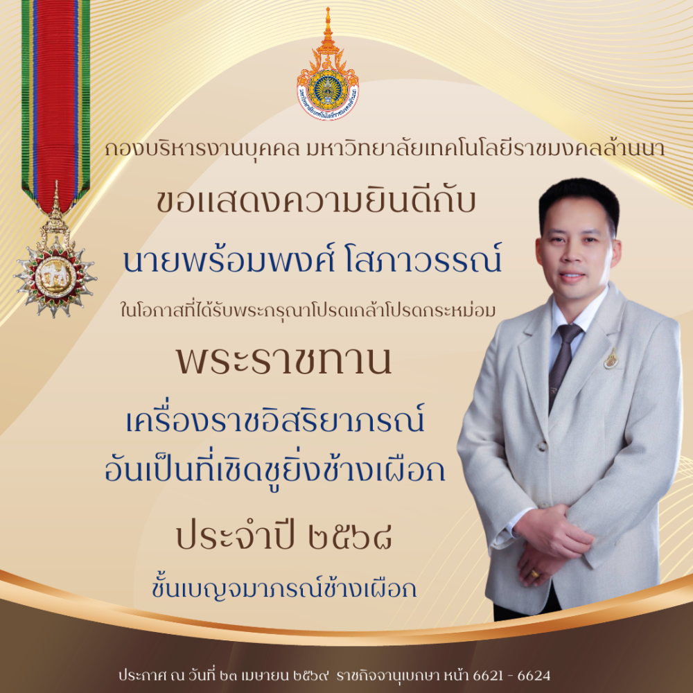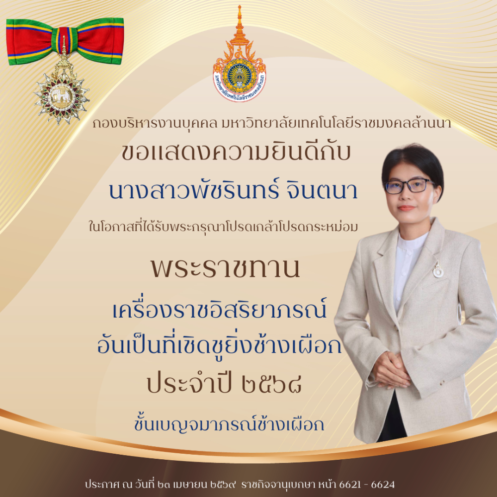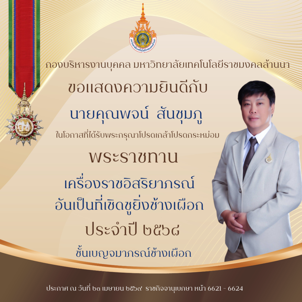 โลโก้เว็บไซต์ ขอแสดงความยินดีกับทุกท่านที่ได้รับ พระราชทานเครื่องราชอิสริยาภรณ์อันเป็นที่เชิดชูยิ่งช้างเผือก และเครื่องราชอิสริยาภรณ์อันมีเกียรติยศยิ่งมงกฎไทย ชั้นต่ำกว่าสายสะพาย ประจำปี ๒๕๖๘ | กองบริหารงานบุคคล มหาวิทยาลัยเทคโนโลยีราชมงคลล้านนา